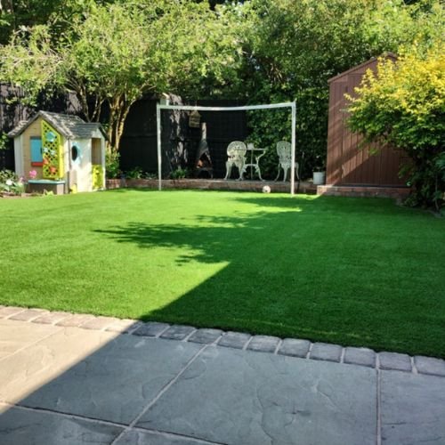 Safe for pets and children, it features weather protection, drainage, and a soft-touch feel.